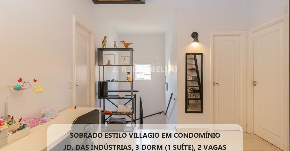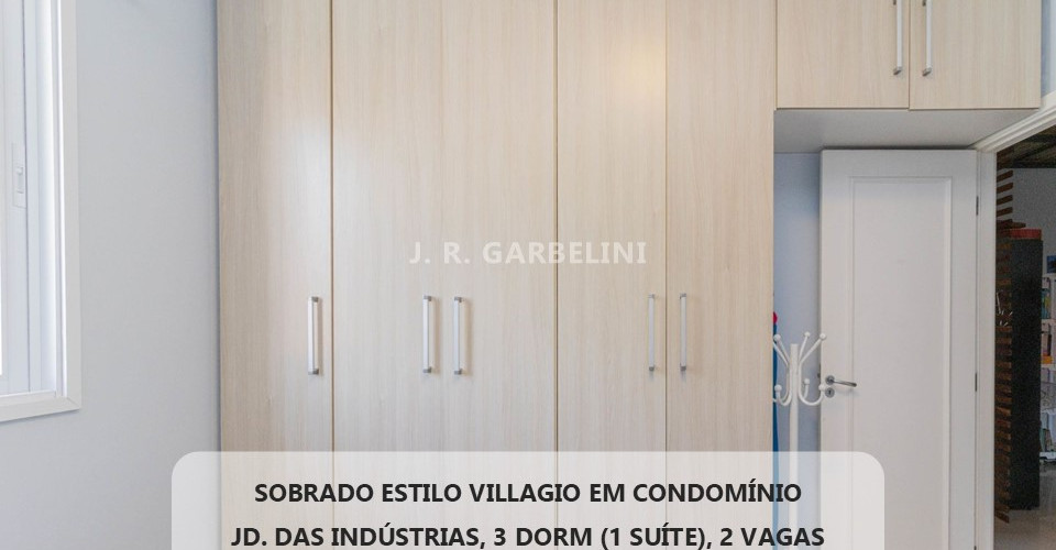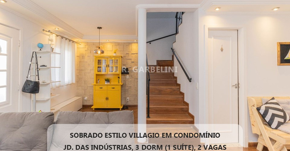 Excelente sobrado estilo Villagio em condomínio fechado no Jd. das Indústrias, com localização privilegiada no bairro, no miolo da ferradura. Condomínio com piscina e play ground.